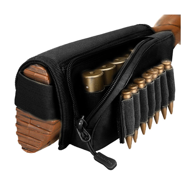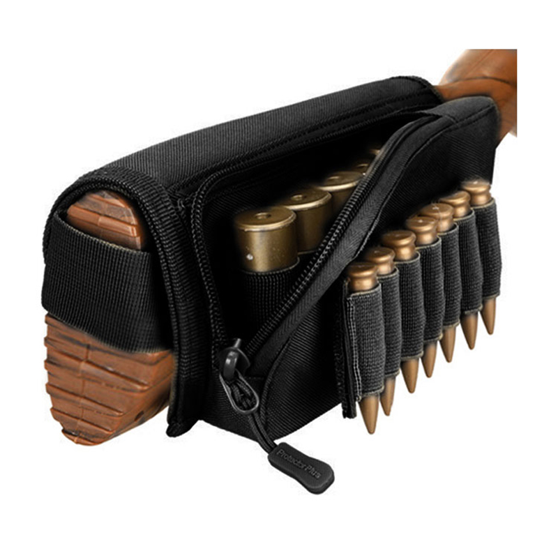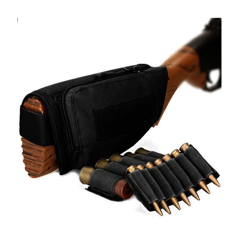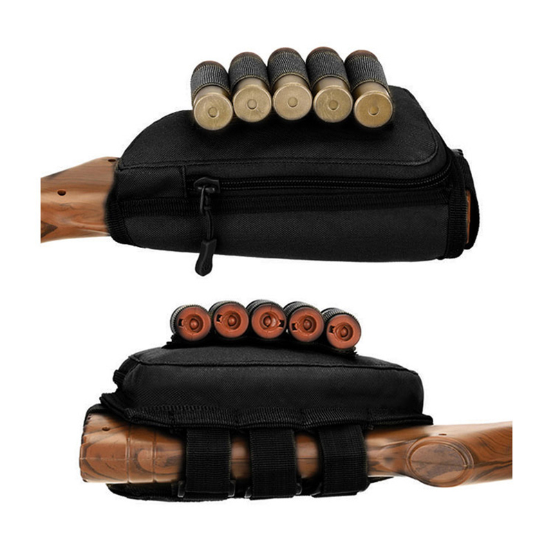Podpórka na kolbę Uchwyt na amunicję Regulowany uchwyt na naboje Transporter myśliwski Praworęczny, szybko odpinany worek na kule do strzelby (5 nabojów) i jednego karabinu (7 nabojów). 2 magiczne naklejki dołączone do elastycznych opasek na amunicję, uchwyt z 5 przegródkami przeznaczony jest na łuskę do strzelby wewnątrz zapinanej na zamek kieszeni użytkowej, uchwyt z 7 przegródkami przeznaczony jest na naboje karabinowe na zewnątrz.