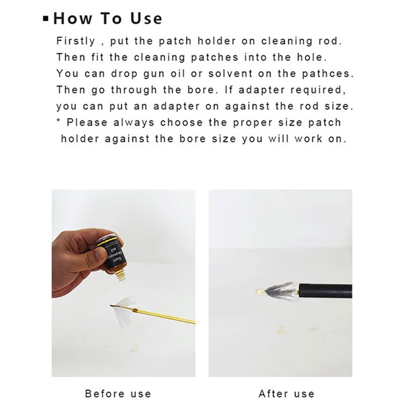 Zestaw 6 uchwytów i adapterów na łatki do czyszczenia broni, 6 Pack uchwytów na łaty do czyszczenia broni/szczelinowych końcówek i adapterów do łączenia prętów, zapakowane w jednym mini etui, to uniwersalny zestaw do czyszczenia broni do pistoletów typu shotgun, pasujący do wszystkich kalibrów. Obydwa adaptery umożliwiają podłączenie ich do wyciorów w różnych nakrętkach. Włóż łatki czyszczące przez szczelinowy otwór, wlewając rozpuszczalnik lub olej do pistoletu, aby oczyścić otwory.