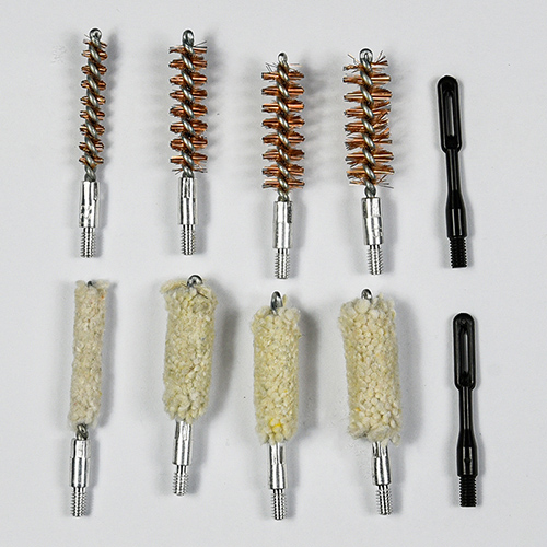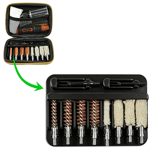 Zestaw do czyszczenia broni krótkiej zawiera 4 rozmiary (.22, 9mm, .40, .45cal.). Pokryty tkaniną OX Etui z PCV zapinane na zamek. Szczotki mosiężne i mopy bawełniane, 2 pręty. Piasek i czerń kolor do wyboru.