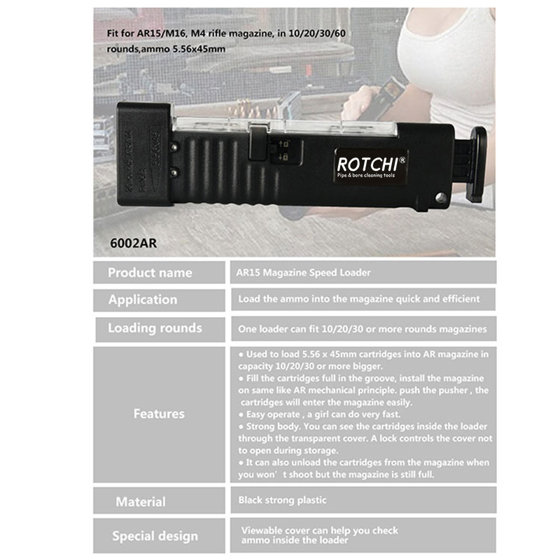 Szybkoładowarka magazynka do AR15 ● Służy do ładowania nabojów 5,56 x 45 mm do magazynka AR o pojemności 10/20/30 lub większej. ● Napełnij naboje całkowicie w rowku, zamontuj magazynek na takiej samej zasadzie mechanicznej jak AR. naciśnij popychacz, naboje z łatwością wejdą do magazynka. ● Łatwa obsługa, dziewczyna może to zrobić bardzo szybko. ● Mocne ciało. Przez przezroczystą pokrywę można zobaczyć naboje wewnątrz ładowarki. Blokada zabezpiecza pokrywę przed otwarciem podczas przechowywania. ● Może również wyładować naboje z magazynka, gdy nie będziesz strzelał, ale magazynek jest jeszcze pełny.