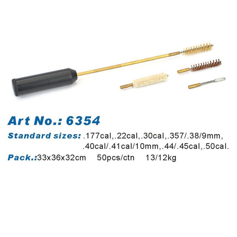 Zestaw do czyszczenia broni krótkiej z wydrążoną rączką, mosiężną szczotką, bawełnianym mopem, nylonową szczotką, szczelinowym uchwytem na łatki, 2 szt. mosiężnych prętów. Wszystkie elementy można umieścić w pustym uchwycie, jeśli nie są używane. Jest to więc bardzo małe i wygodne narzędzie czyszczące do czyszczenia pistoletu/pistoletu.