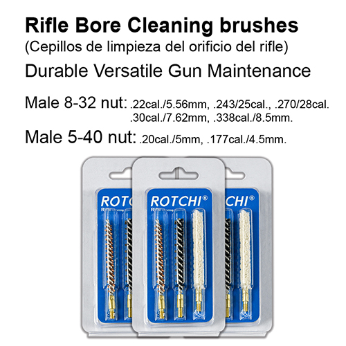 Zestaw szczoteczek do czyszczenia lufy karabinu 3 w 1, opakowanie typu blister i karton. Dostępne rozmiary: .177, .22, .25, .27, .30, .338 cal.