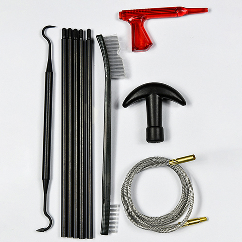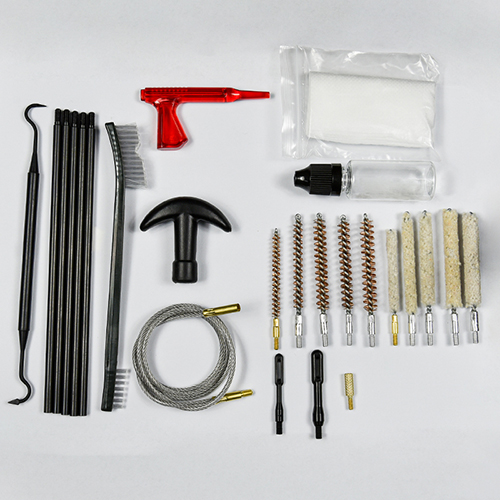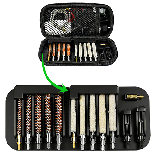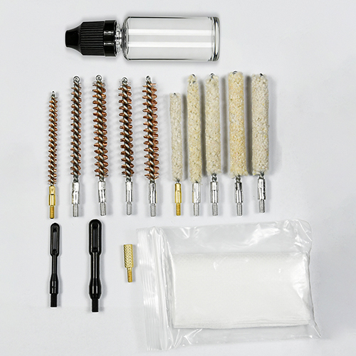 Zestaw do czyszczenia karabinu zawiera 5 rozmiarów (.177, .22, .243, .27, .30 cal.), mosiężne szczotki i mopy bawełniane, 5 prętów, 2 kalby. Kolor piaskowy i czarny do wyboru.